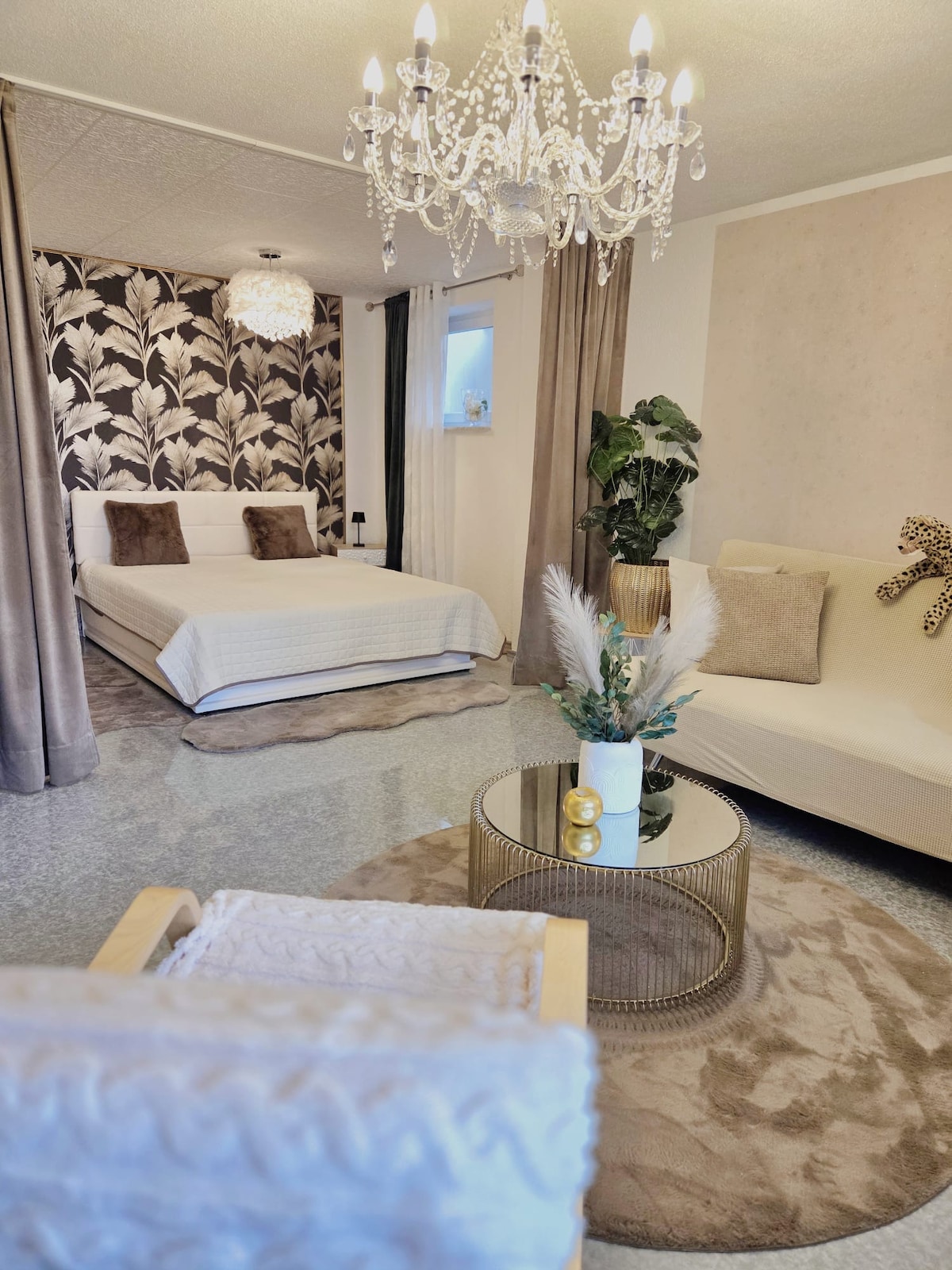 Willkommen in deiner 125qm-Wellnessoase – pure Entspannung und Komfort! Zwei Schlafzimmer mit 4 Betten bieten erholsame Nächte. Erlebe die Sauna für 4 mit Himalaya-Stein, die XXL-Dusche und den Balkon mit Whirlpool, Grill und Esstisch – mit atemberaubendem Panorama-Ausblick. Die Galerie überzeugt mit Chillecke, Schreibtisch und Trainingsmöglichkeit und einem Bett. Das Wohnzimmer besticht mit riesigem Sofa, Fernseher und Schaukel. Die moderne Küche hat ein Induktionsherd und großen Kühlschrank.