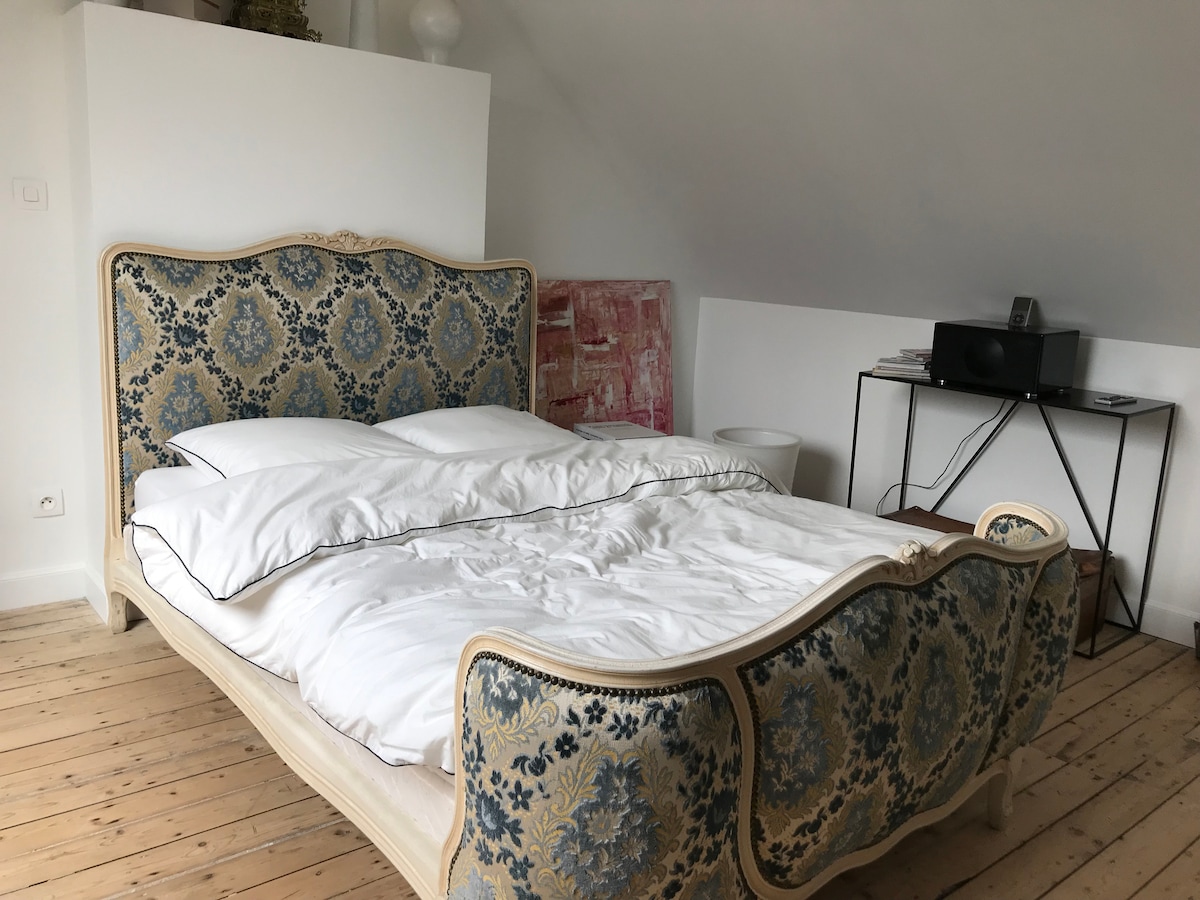 Situé au 2ᵉ étage d’une grande maison de maître, ce logement est idéal pour accueillir votre famille. Il comprend un lit queen-size, un grand canapé convertible dans le salon, une salle de bain avec baignoire, ainsi qu’un coin cuisine équipé (micro-ondes, évier, vaisselle). Vous aurez également accès à la cuisine, au jardin et à l’espace de remise en forme (espaces partagés). Pour rendre votre séjour encore plus agréable, petit-déjeuner et massages bien-être sont proposés en option.