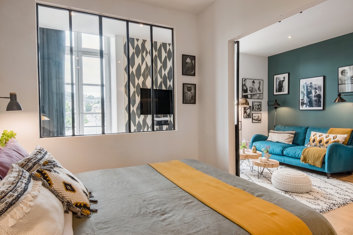 Avec ses baies vitrées et sa terrasse, ce gite offre une vue panoramique de choix sur Rouen. Ce lieu tendance dispose d'une grande pièce à vivre lumineuse avec une cuisine ouverte sur le séjour, un espace de télétravail, 2 chambres et 1 salle de bains. De plus, vous apprécierez le confort, le calme et la climatisation. Stationnement gratuit dans la rue. Possibilité de stationner vélos, scooters ou motos (garage). A 20 mn à pied de la gare SNCF et du centre ville. Station de bus à proximité