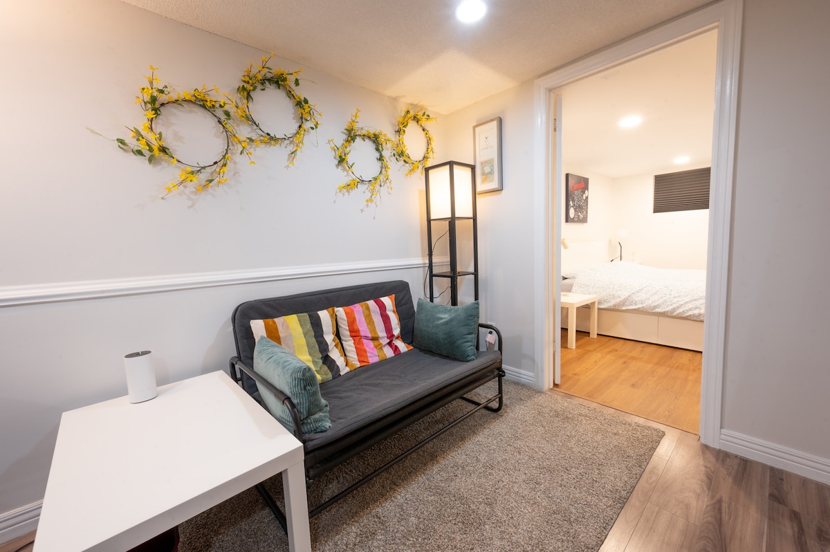 · Snowless Parking, 1 bed 1 bath, 1 living room, with full laundry and kitchen, refrigerator of course! and they are exclusively for your use! · Comfy environment with queen-size bed, cozy vibe, as well as keypad entrance to secure your safety. · Located in a quiet neighborhood. 1 minute to forest park and run field. · Provide 1 parking. 3 mins walk to bus stops. 10 mins drive to Highway 401. · Escape the busy and relax in this your premium highly privacy little basement apartment.