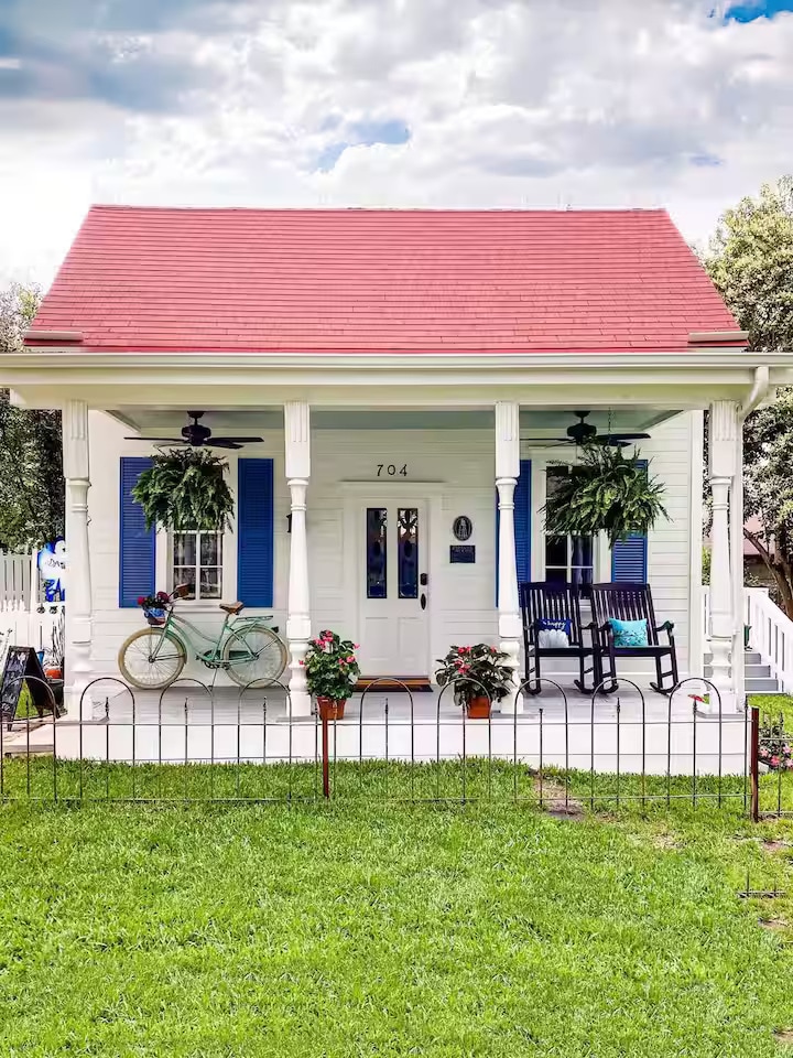"The Saradora House" is an adorable 1920s 2Br/1Ba house that sits directly on the edge of downtown Round Rock - directly across from the Woodbine Mansion & walking distance to many restaurants & bars. This classic home features updated appliances, yet maintains the charm of an old house with its design and decor. The yard is beautifully landscaped with a pathway that encircles the house + the back yard features a spacious, screened-in porch with swinging chairs for relaxing outdoors.