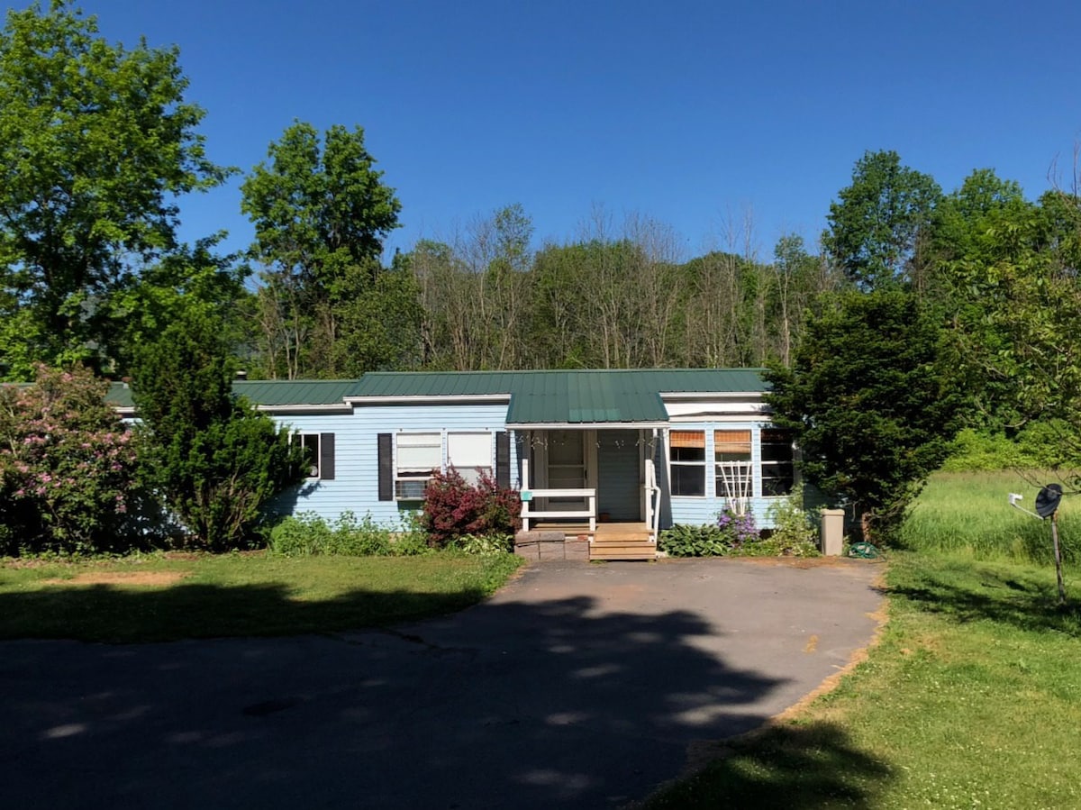 Clean spacious mobile home on quiet country road with views of mountains from yard and windows. Quiet getaway adjacent to acres of wooded marshlands and fields; only 5 – 10 mins from various trail heads up into the state park land, 15 mins from both Catskill and Saugerties Thruway entrances, 30 mins from Hunter and Woodstock. 20 mins from HITS. No plastic water bottles! water here is excellent: Water pump replaced Nov 2024 for excellent pressure and springs in the yard!