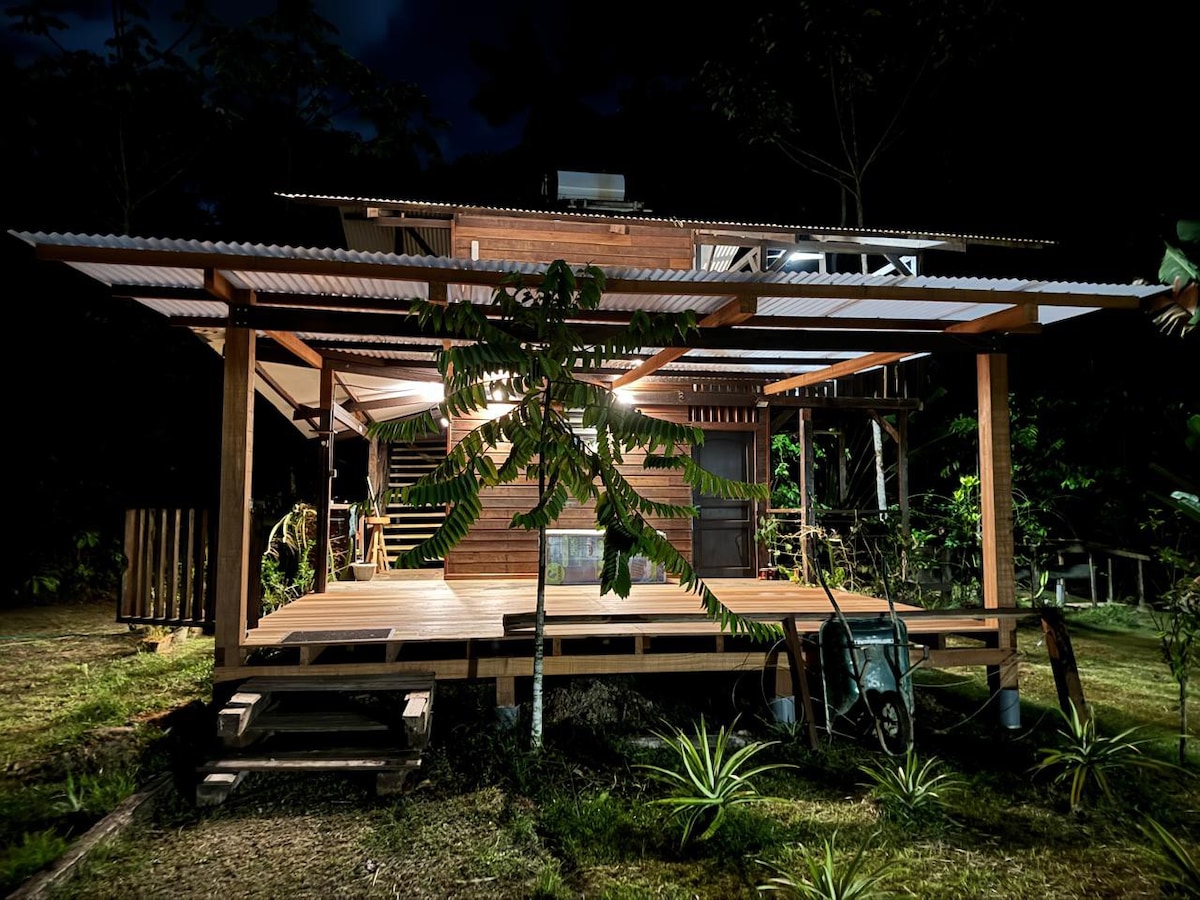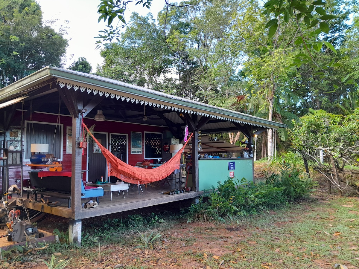 Carbet/maison en bois indépendant, avec deux chambres fermées, une terrasse extérieure, avec cuisine et salle de bain (avec eau chaude) ouvertes sur la forêt. Vous aurez accès à la grande piscine de la propriété et à un parking privatif (2 voitures max). Wifi par fibre optique Jardin fruitier et ornemental d'un hectare en permaculture. Endroit calme et reposant pour les amoureux de nature et de simplicité, où les morphos et colibris viendront régulièrement vous rendre visite.