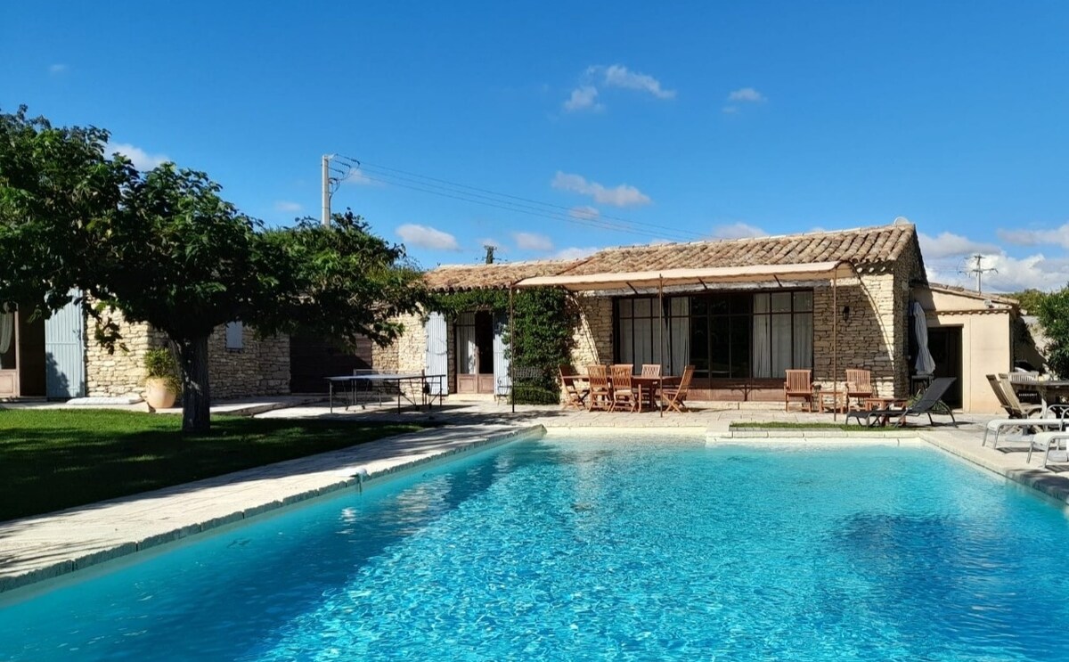 Dans le parc regional du Luberon, petite maison rénovée en 2022, de 70m2 avec piscine partagée et sécurisée avec pool house, sur un terrain entièrement fermé et clos de 2950m2, maxi 6 personnes ( 2 chambres, une avec lit double et une avec 2 lits simples ainsi qu’un canapé convertible 2 places). Cuisine entièrement équipée (frigo américain, lave vaisselle, lave linge, micro onde, télévision, accès wifi). A seulement 10 minutes à pied du centre de Roussillon. Disponible aussi sur «gîtes fr »