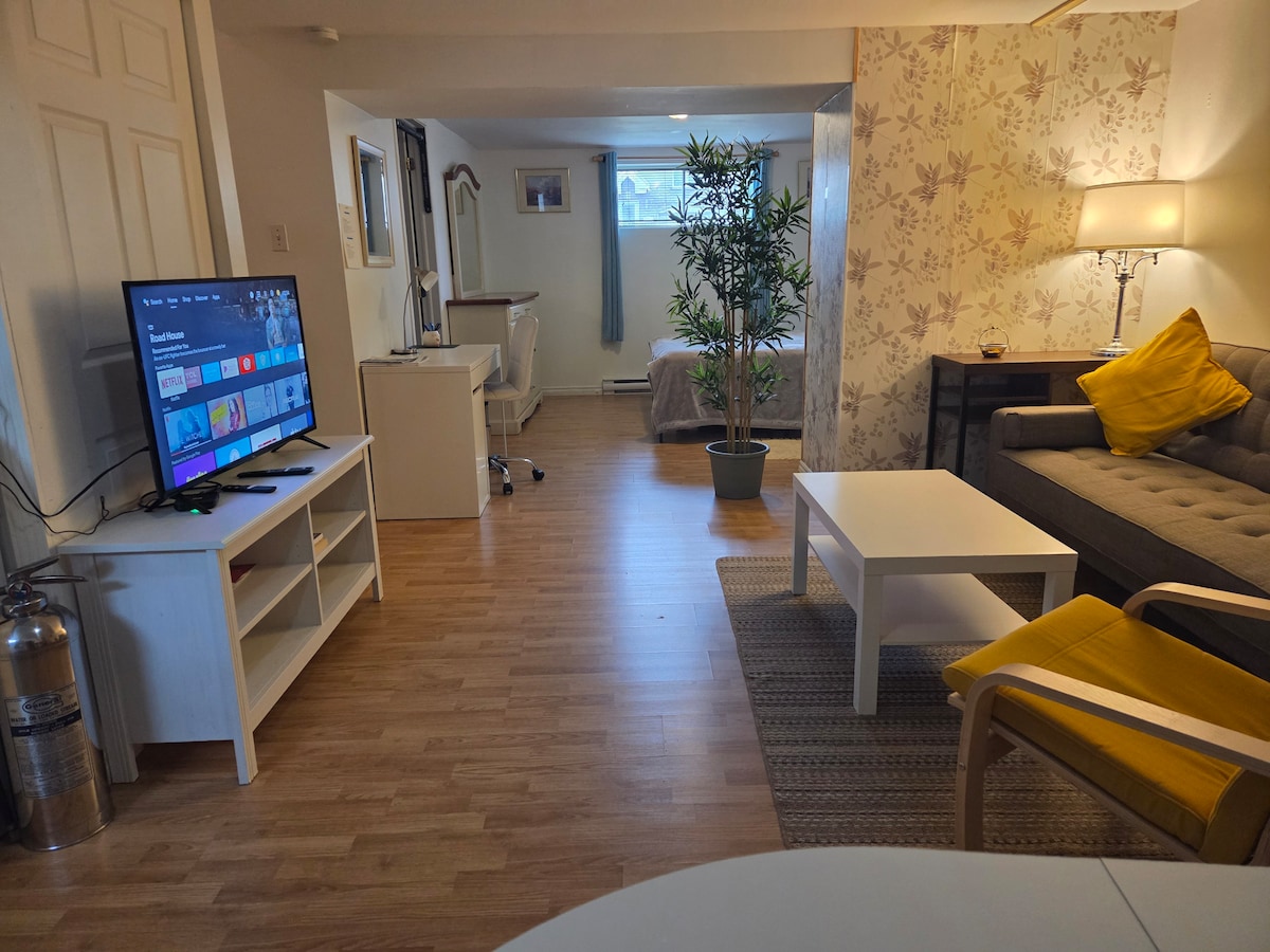 Joli studio décoré avec goût. Situé face à un parc et arrêt d'autobus. Près d'une belle piste cyclable et du fleuve Saint-Laurent. Situé à 20 minutes en voiture du centre ville de Montréal et à 7 minutes en voiture de l'aéroport Trudeau . Mobilier récent. Lit mural confortable. Entrée privée. Mail commercial situé à 3-4 minutes à pied. Quartier résidentiel tranquille. Accès à Netflix, télé Roku 4K, haut-parleur Bluetooth, internet haute vitesse. Wifi 7. Léger déjeuner continental compris.