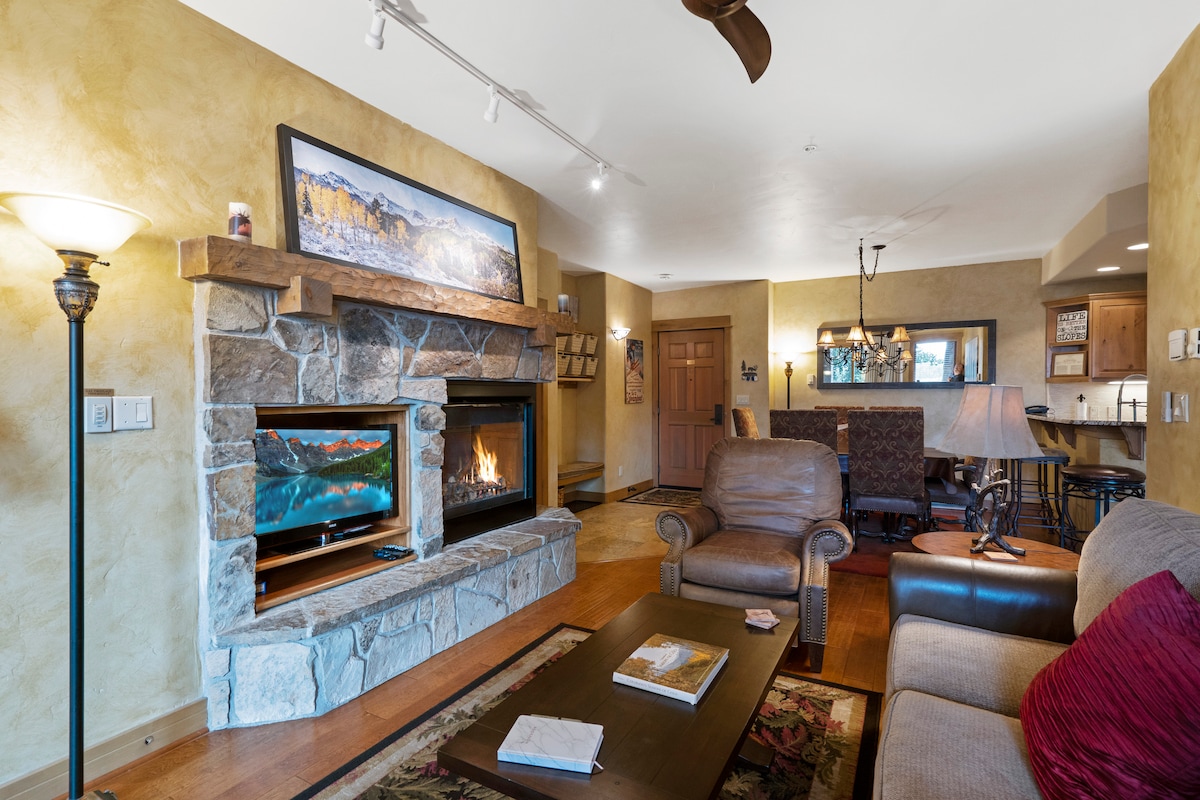 Ski condo only 5 minutes ride to ski mountain on free bus at condo complex and short drive to downtown. Hot tub out back door! King bed in private bedroom. Updated bathroom 2025 and new flooring throughout condo. -Full size, well stocked kitchen with regular & Keurig Coffee -Living room with New Gas Fireplace, leather reclining sofa, 50 inch TV, high spd WiFi, cable and streaming (Netflix, Amazon Prime, HBO Max). -Washer/Dryer in unit -Free Bus Stop: short walk from condo door -Ski Locker