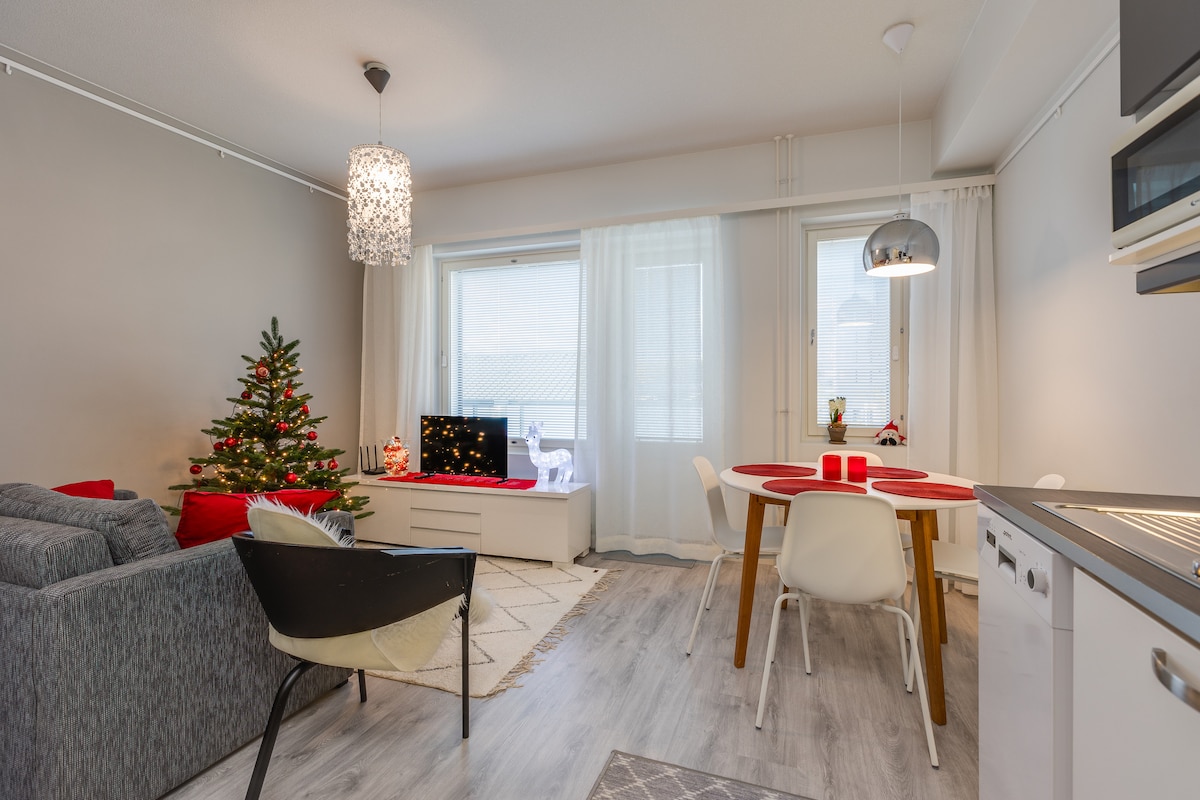 Fully-equipped modern apartment for a pleasant stay in Rovaniemi winter wonderland. ❆ 56 m² stylish apartment ❆ All the modern facilities and fully furnished kitchen ❆ Private balcony ❆ Free parking ❆ Great location next to city center. Safari offices, city center restaurants, cafeterias and shops are only 5 minutes walk away ❆ Bus stop to Santa's Village only 4 minutes walk away ❆ Next to a beautiful river side walk