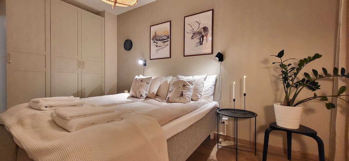 Relax in your private sauna in this fully renovated, modern apartment in the center. ★ "...clean, modern and beautifully decorated. Highly recommended!" ☞ Sauna & free parking. ☞ Fully equipped + stocked kitchen ☞ 65” Smart-TV & 500 MB wifi. ☞ Fully renovated. 》2min walk to shopping, restaurants, and arctic tours. 》3min walk to airport/Santa Claus shuttle bus. 》11min drive to Santa Claus Village and to ✈ airport 55m2 stylish home on the 1st floor –> no elevator. Book now before it’s gone!