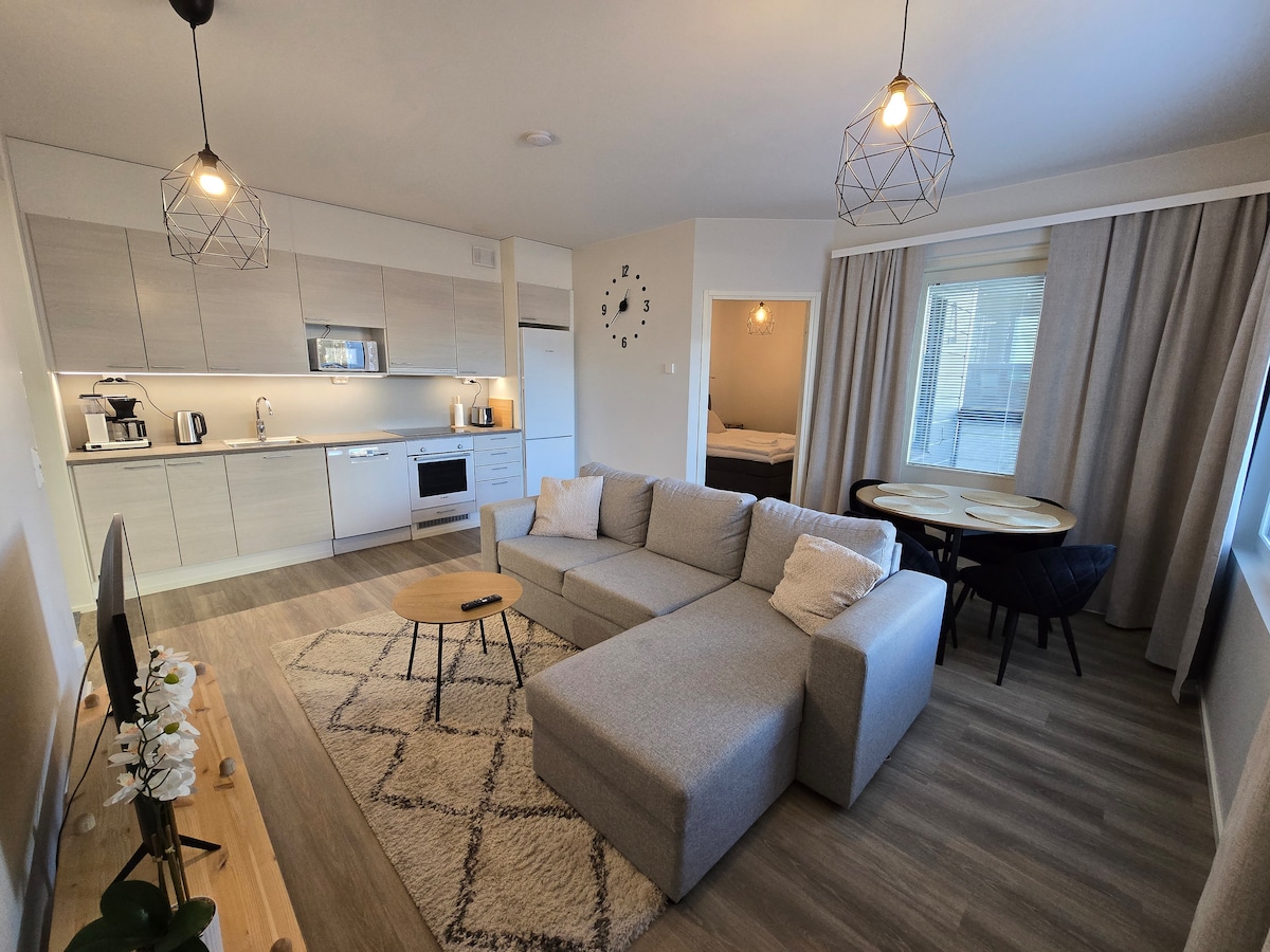 Fully-equipped modern apartment for a pleasant stay in Rovaniemi winter wonderland. ❆ 56 m² stylish apartment ❆ All the modern facilities and fully furnished kitchen ❆ Private balcony ❆ Free parking ❆ Great location next to city center. Safari offices, city center restaurants, cafeterias and shops are only 5 minutes walk away ❆ Bus stop to Santa's Village only 4 minutes walk away ❆ Next to a beautiful river side walk