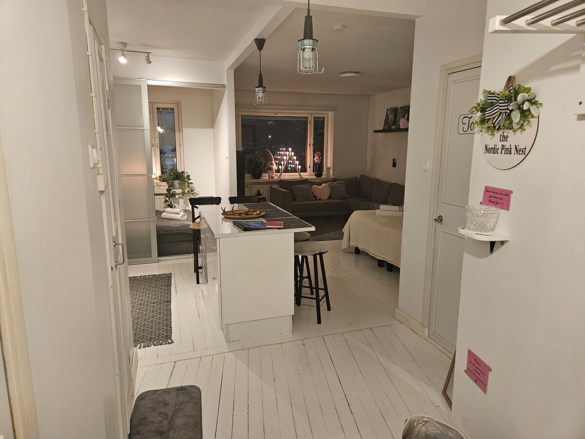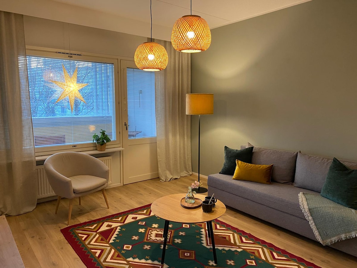 * 44 m2 renovated home with Scandinavian-style interior * Great location in the city center * All the modern facilities incl. original Finnish sauna * Safe and calm * Suitable for families, business travel or 4 adults - Lot's of public parking spots right at the door - 2 min walk to bus stop - Easy pickup place for safari trips