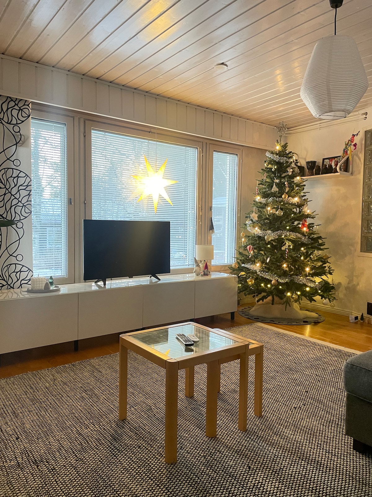 A modern and cozy 70 m² home on a forested hillside, just 3 km (5 min) from Rovaniemi city centre. Here you can enjoy peace and quiet while still being close to all services. The home features a spacious living room, fully equipped kitchen, sauna, and two bedrooms for up to 6 guests. The private backyard forest includes a small sledding hill, and you can spot the Northern Lights from the yard. Linen, towels, WiFi and free parking included. A perfect Lapland stay. Car rental available.