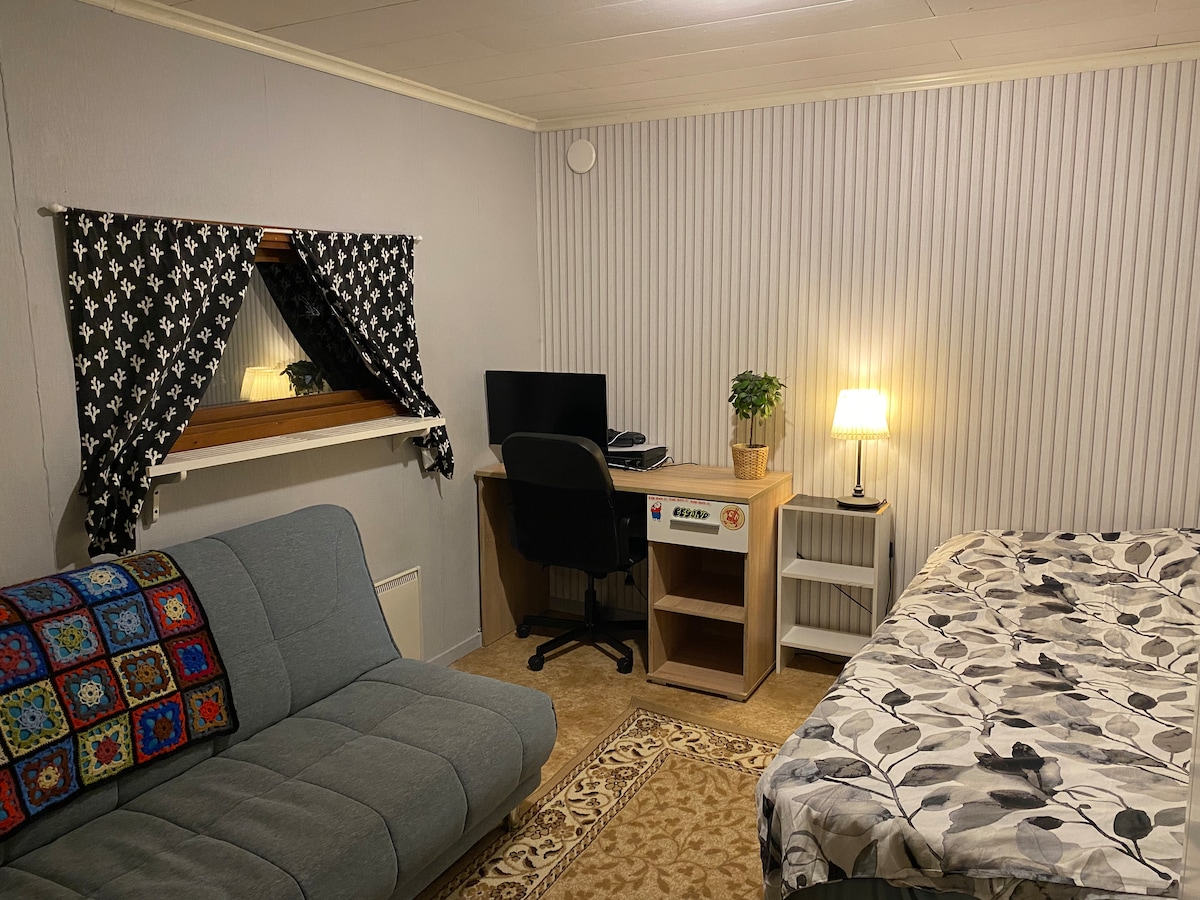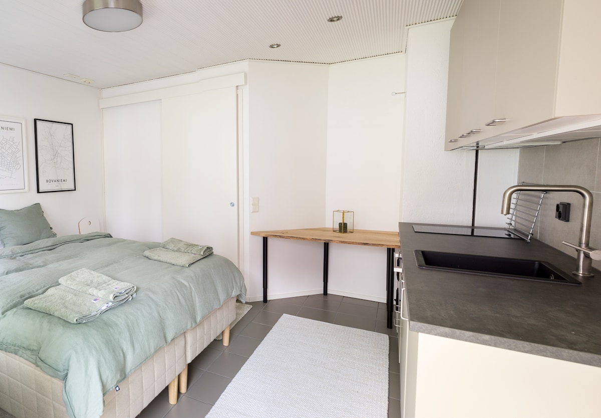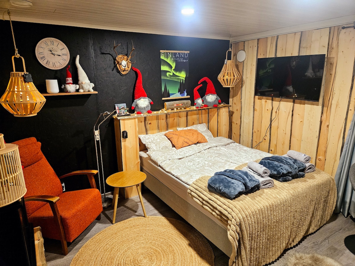 Perfect location in the center of Rovaniemi, in the heart of Lapland. Enter an atmospheric, peaceful guesthouse with Lappish interior design with its own entrance. You have a 30-square-meter studio apartment with a kitchen and your own sauna. The guest house has everything you need for home-like, yet luxurious accommodation. You also have your own parking space. The guesthouse is suitable for two adults, but two children sleep well in the loft of the apartment.