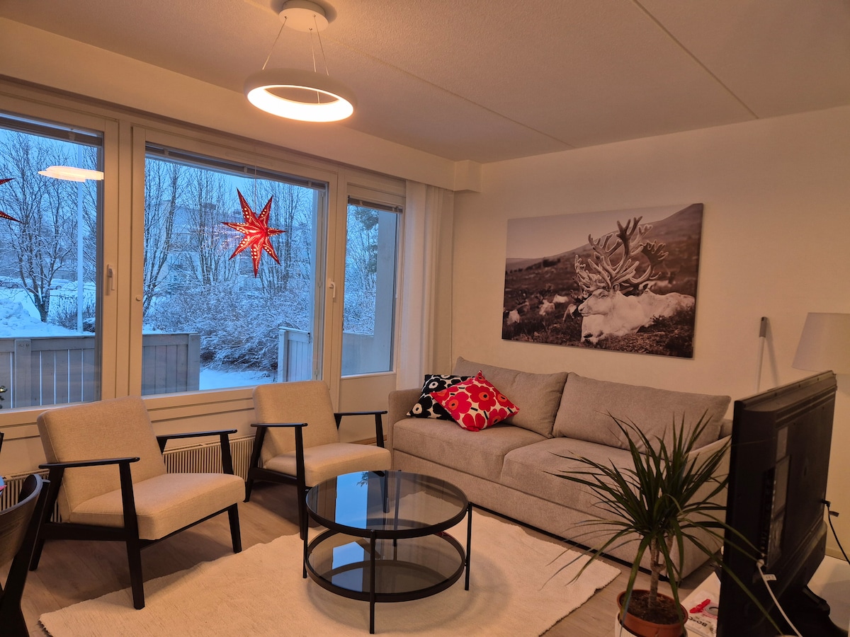 Relax in your private sauna in this fully renovated, modern apartment in the center. ★ "...clean, modern and beautifully decorated. Highly recommended!" ☞ Sauna & free parking. ☞ Fully equipped + stocked kitchen ☞ 65” Smart-TV & 500 MB wifi. ☞ Fully renovated. 》2min walk to shopping, restaurants, and arctic tours. 》3min walk to airport/Santa Claus shuttle bus. 》11min drive to Santa Claus Village and to ✈ airport 55m2 stylish home on the 1st floor –> no elevator. Book now before it’s gone!
