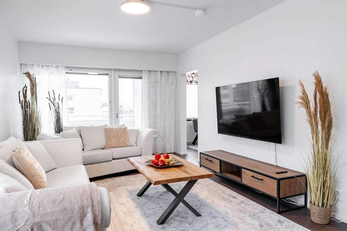 Winter Dream Suite – Luxury and Relaxation Near the City Center This high-quality and spotless apartment accommodates up to four guests and features a private sauna and a cozy balcony. The location is perfect: a peaceful setting ensures restful nights, yet the city center with its services and attractions is just a short walk away. Scandinavian style 2nd floor apartment has a large living room, alcove with queen size bed, sauna and furnished balcony. Fully equipped kitchen.