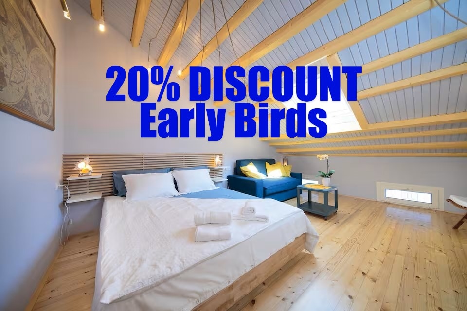 Welcome to our renovated cozy apartment on the 3rd floor (attic) of a small condominium. There is one bedroom, kitchen, bathroom. Smart TV with Satellite & Terrestrial, AC-air conditioning & free Wi-Fi internet. Free parking for guests in Zone 4 ranging from 9 min. to 19 min. by foot from the apartment.