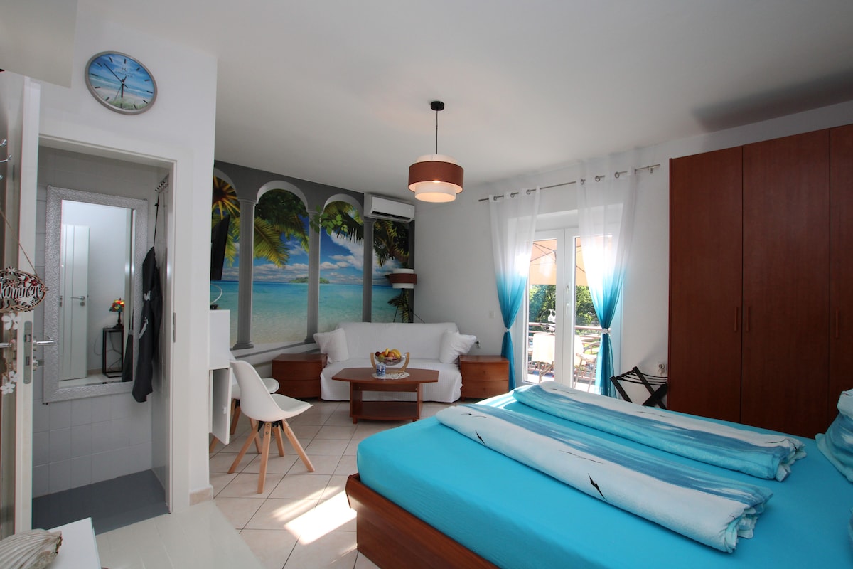 Blue Adria Suites are private studio apartments each ideal for 2 people. Studio apartments contain ensuite shower / toilet, double bed, mini block kitchen with refrigerator, sink, 2 electric hobs and filter coffee machine, and a sofa. Each studio has a balcony with a parasol and a seating area for 2 people, overlooking the garden or a quiet street. Studio apartments are air conditioned, and guests have access to Wifi. Parking is provided in front of the house or along the street.