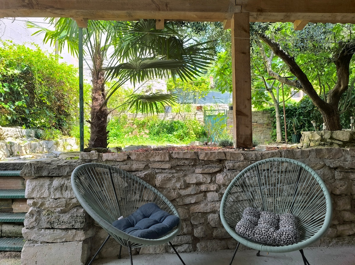 Holiday house casa Roveria is a newly renovated Istrian stone house in a row. It is located in a small, quiet village Bonašini near Svetvičent in central Istria. The house is fully furnished and has everything for your vacation, peace and privacy. In the yard is a whirlpool with loungers for relaxation, the ground floor is the living area, while the first floor is the bedroom. Casa Roveria offers an ideal place to relax and unwind in a traditional setting of wood, stone and Mediterranean plants