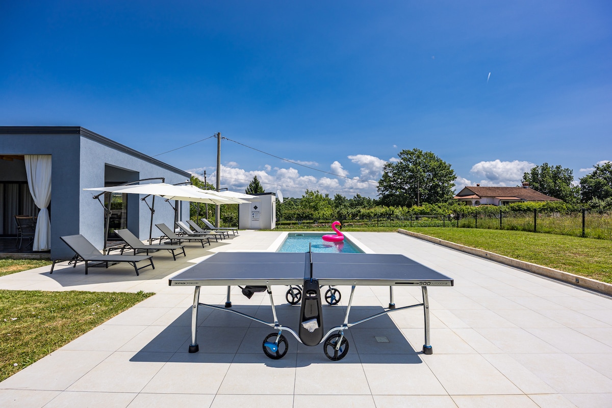 Stylish villa near Rovinj with picture worthy pool, sunk in hot tub, sauna. Wake up to lush, panoramic valley views. Couples and family-friendly, a short drive to adventure park, Brijuni National Park, dinopark, medieval towns & local cuisine. It is a true green escape for anyone looking to get back to nature with all the comfort of modern living. Fully equipped for cooking and entertainment in 2600 m2 of garden (football, speed ball, badminton & pool fun) for your kids and loved ones to enjoy.