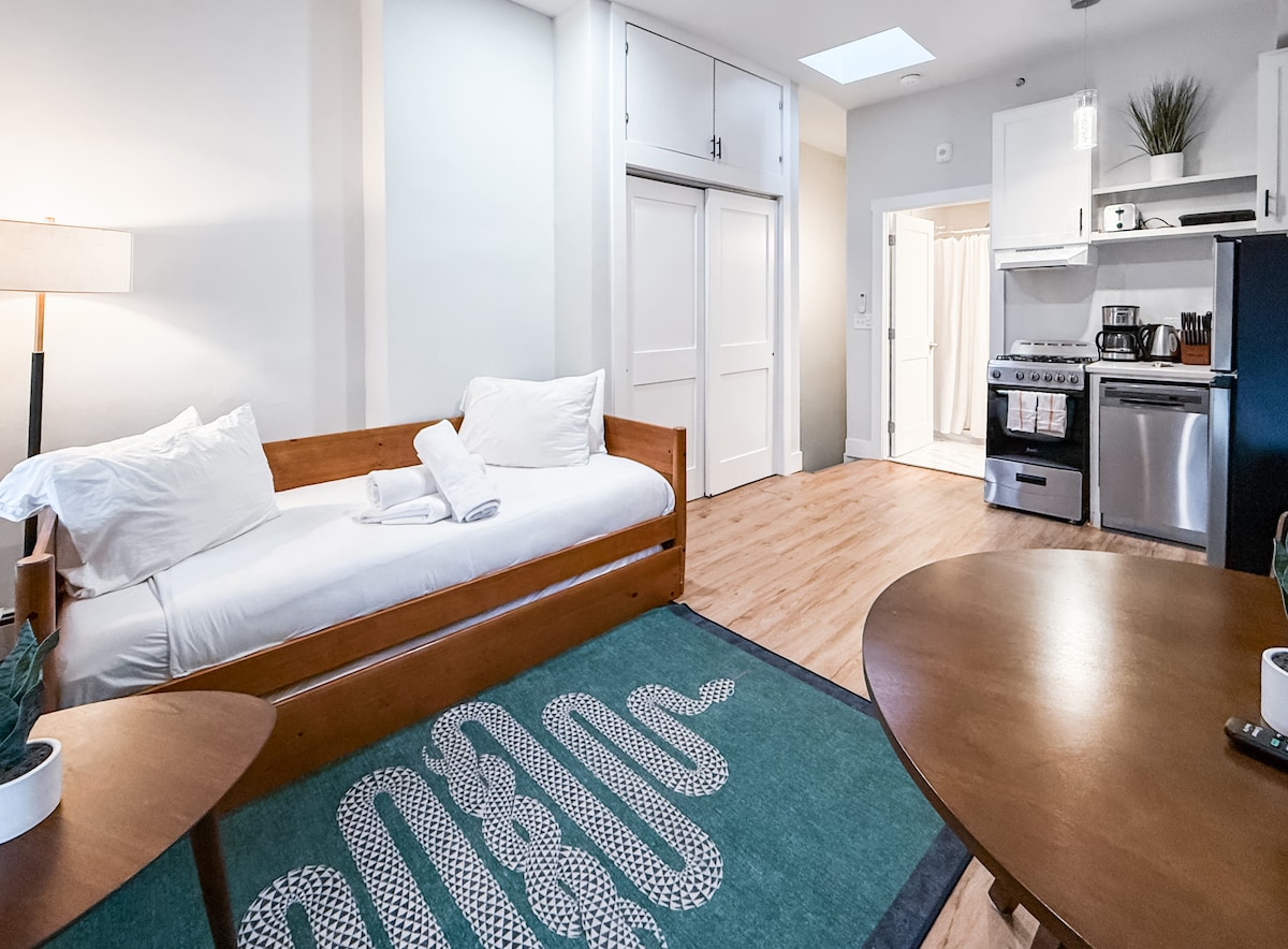 Beautiful top floor luxury apartment in stately Victorian home. Extraordinary views of historic park as your front yard! Your own entrance through a private garden. Apartment is a studio-style open living space with full kitchen, living area, and bedroom bay with queen bed. Also includes loft bedroom with 2 twin beds.