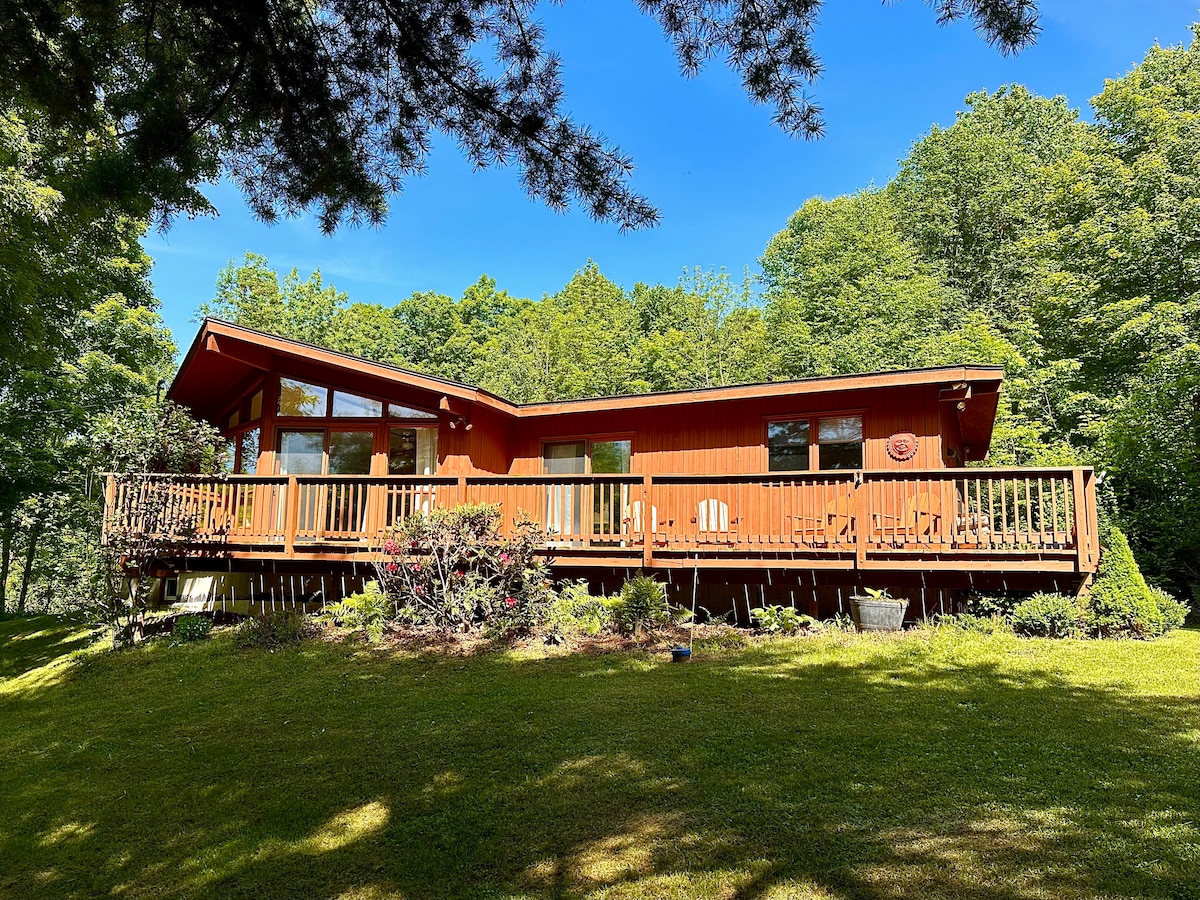 This Catskill cottage is situated on 12 secluded acres with stunning mountain and valley views. The main house features three well-appointed floors with two bedrooms downstairs, a primary bedroom with ensuite on the top floor and a wood burning stove on the main floor. The property also features a separate studio with a large stone patio, fire pit, cedar hot tub, pond, and scenic forest trail beyond. Close to skiing, hiking and golfing!