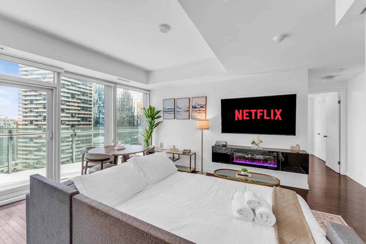 Luxury newly furnished home away from home in central downtown 300 Front Street with balcony CN Tower view. 2 Bedroom 2 Bath, Comfortable King bed TV en suit, Double bed TV w blackout curtains Enjoy in building Gym, Steam room, Outdoor pool with 360 degree view of the city, Whirlpool, and BBQ. Steps away from CN Tower, Rogers Centre, Aquarium, Metro Convention Centre, short walk to Scotiabank Arena, the lake, Bell Lightbox, Billy Bishop Airport, Union Station, Entertainment District and more