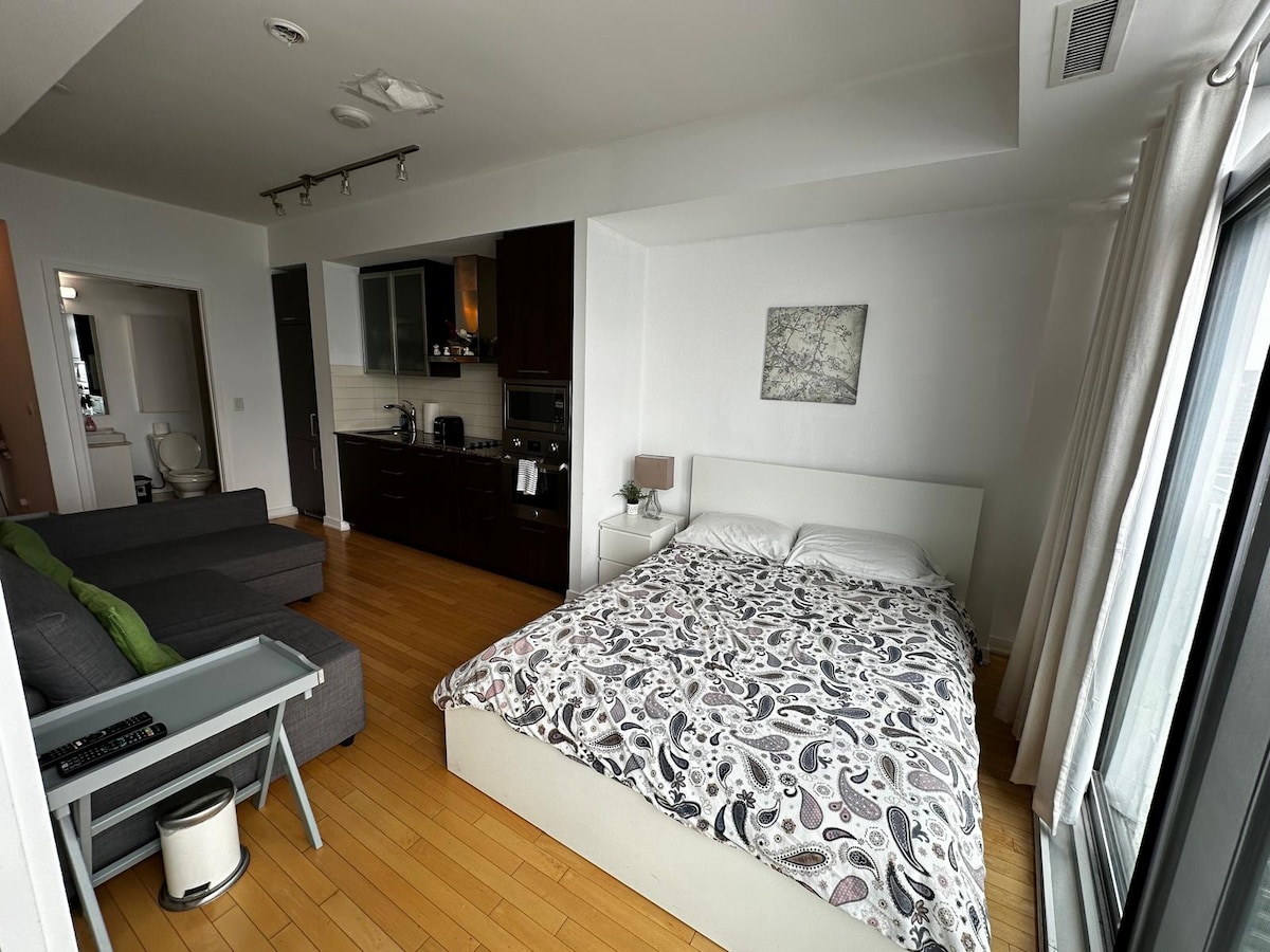 Enjoy a trendy and cozy experience at this centrally located condo. This 1 bedroom, 1 bathroom unit is located in the heart of the city within walking distance to many of Toronto's most popular restaurants, bars and tourist destinations. Steps away from King street, The Well and walking distance from the CN Tower, Rogers Centre, Ripley' s Aquarium and much more. The unit is equipped with high speed Wi-Fi with unlimited internet. You can also enjoy the gym and studio room.