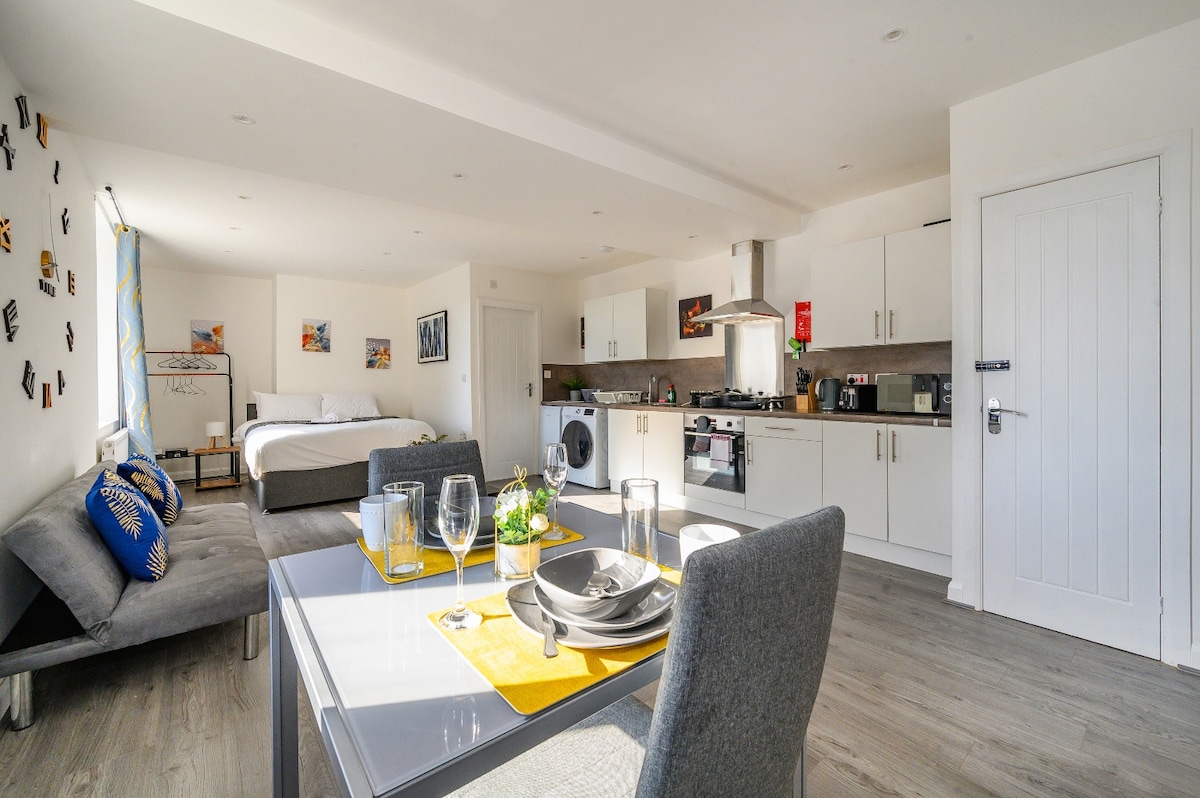 A stylish city-centre loft with exposed beams, luxury tech, and unique touches. Enjoy a 55” Sky Glass TV with full Sky, Netflix & more, a 27” 5K iMac workstation, and a sweet shop for all ages. Sleeps up to 5 with comfy beds, full kitchen, new bathroom, and fast Wi-Fi. Walk to shops, restaurants, and attractions. Car park 30 secs away. Second-floor (stairs only). Self check-in. Vibrant area—light sleepers note urban sounds. Mid-stay check applies to stays over 3 nights.