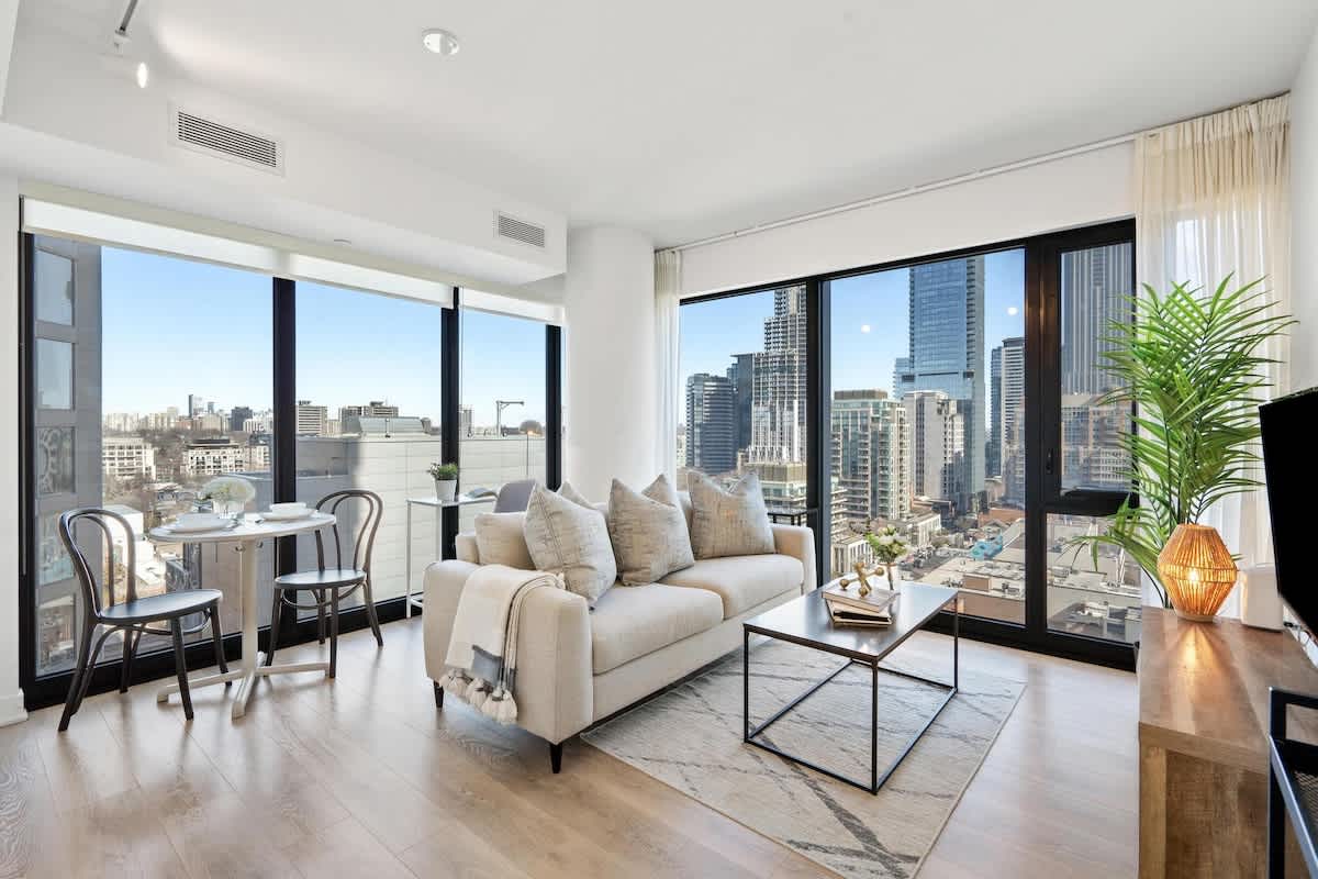 Housed in a former Four Seasons Hotel in Toronto’s prestigious Bloor-Yorkville neighbourhood, this modern high-floor condo places you in the heart of downtown Toronto — walkable, elegant, and just steps from museums, acclaimed restaurants, luxury retailers, boutique shops, and major subway lines. Inside, the fully renovated 1-bedroom features soaring 9-foot ceilings, designer furnishings, curated artwork, luxury bedding, and sunlit bay windows — a boutique city escape for solo or duo travellers.