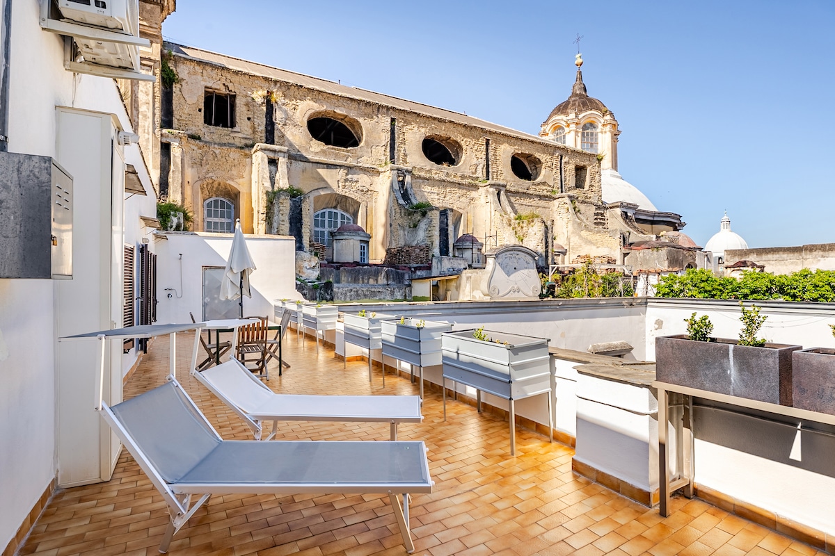 Luxury apartment: a combination of classic elegance and modernity, just renovated with JACUZZI and PRIVATE ROOFTOP of 90mq where you can admire the volcano Vesuvius. Located in a historical building on the 3rd floor without elevator in the heart of the old town, you can reach everything by walking. WiFi, PrimeVideo, Nespresso and luggage storage for FREE Points of interest • 2 min Duomo • 4 min Underground Naples • 6 min Metro L1 & L2 • 5 min Train Station • 10 min Harbour