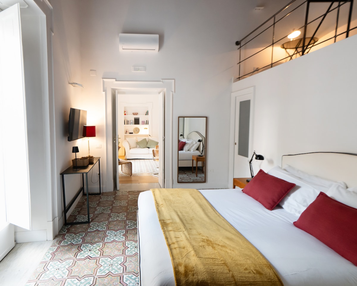Luxury apartment: a combination of classic elegance and modernity, just renovated with JACUZZI and PRIVATE ROOFTOP of 90mq where you can admire the volcano Vesuvius. Located in a historical building on the 3rd floor without elevator in the heart of the old town, you can reach everything by walking. WiFi, PrimeVideo, Nespresso and luggage storage for FREE Points of interest • 2 min Duomo • 4 min Underground Naples • 6 min Metro L1 & L2 • 5 min Train Station • 10 min Harbour
