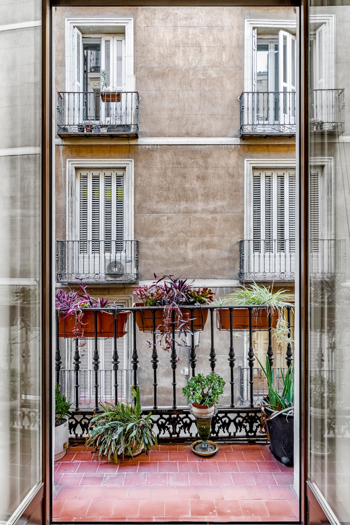 “Vine” apartment is located in Madrid center, off Gran Via, on a quiet street in a new building with elevator. It is nature-inspired, bright & modern, has WiFi, is fully equipped and is very close to restaurants, tapas, the Metro, shops & galleries. Best for a single, couples or couples with a kid! Pets are invited happily!!! The apartment is located in a new buliding, with an elevator! It is modern designed, with lots of greenery, themed to its name, Vine. A huge window along the length of the whole apartment overlooks a beautiful private garden. The apartment consists of a bedroom with a double bed, a living area with a single pull-out sofa, kitchen and bathroom. It has WiFi and is fully equipped, including a washing machine, TV, air conditioning, and Nespresso coffee maker - all just ready for your comfort and enjoyment! The apartment is a studio open space apartment - and it's all yours to enjoy! There are no areas in the apartment that you cannot use or access! We love hosting, but also respect our guests' privacy! We are here for you as much as you would like! Located just off Gran Via in lively buzzing Malasana neighborhood with its great range of authentic cafes, tapas & bars. Huge Zara Primark & Mango are minutes away. Best Madrid sites like Royal Palace, Puerta del Sol & Museums are in walking distance The Central Metro Station Gran Via is a 2 minute walk from the apartment. From there you can take the metro to anywhere you want in Madrid and also to all the train stations that will take you out of Madrid to the rest of Spain. If you come by car, a big parking lot is located at Barco 1, Madrid, just a minute from the apartment. There is also a bicycle-rental station close by. A hosting kit of water, soda, milk, coffee, tea and sweetners will be waiting to welcome you :-)