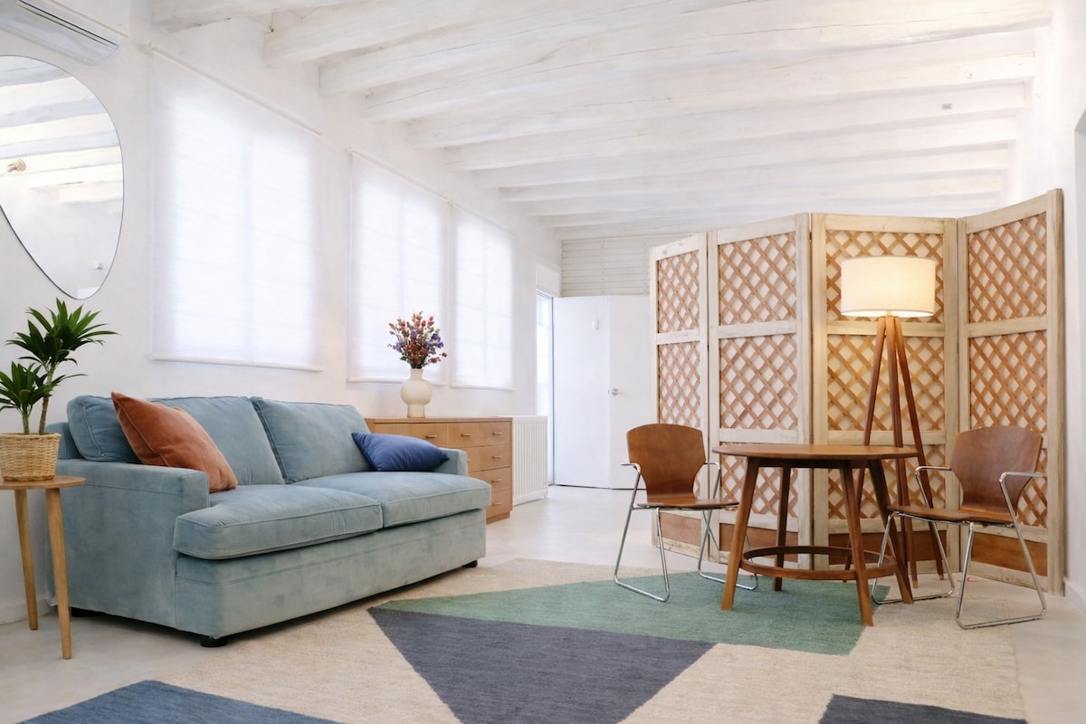 Bright and cozy loft in the heart of Malasaña, one of Madrid’s most vibrant and creative neighborhoods. With 40 m², high ceilings, and exposed wooden beams, it has a warm, character-filled atmosphere. It includes a fully equipped kitchen, living area with sofa, comfortable bed, and a compact bathroom once used during photo sessions. Originally my photography studio, it retains its open layout, artistic spirit, and unique charm, perfect for couples’ getaways.