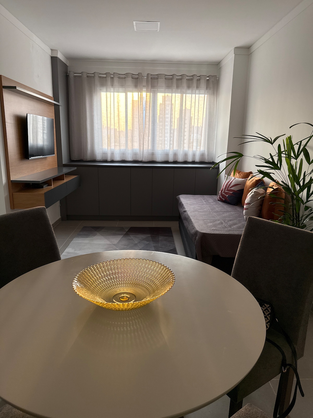 Apartamento novo central , muito aconchegante, com linda mobília , possui um quarto com ar condicionado e com uma cama de casal Cozinha completa com todos utensílios . Uma vaga de garagem Na entrada do prédio possui uma Paneteria Café Brasil . Supermercado, farmácia , pizzaria e restaurante tudo a 100 metros do apto ,