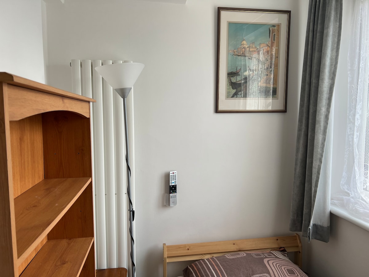 房间位于宁静的房子内,交通便利。
