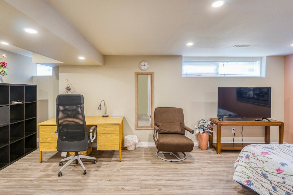 Relax with the whole family at this peaceful place to stay. Bright, lower-level 1 bedroom suite on a family-oriented street. Close to park, trail, walking distance to restaurants and grocery stores, outdoor public pool, public transportation, easy access to 401, 409 and 427, 10 min to Airport and 25 min to downtown Toronto. Parking available. Furnished with queen bed, fully equipped kitchen, large dining-living room, big TV, Wi-Fi, sofa, portable bed, laundry.