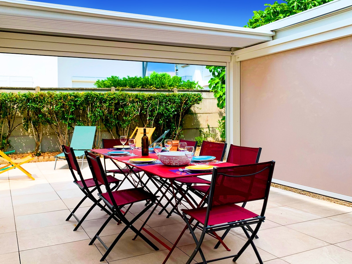 Simplifiez-vous la vie dans ce logement paisible et central, 300m de la plage et du centre ville (moins de 5 mn à pied). 2 chambres dans la maison et 1 séparée du bâtiment principal à l’extérieur ( pas de wc ni salle de bain) 1 salle de bain et 1 wc dans la maison. Cuisine avec grande table , ouverte sur le salon . Tout confort ,meubles de qualité . Idéal en famille