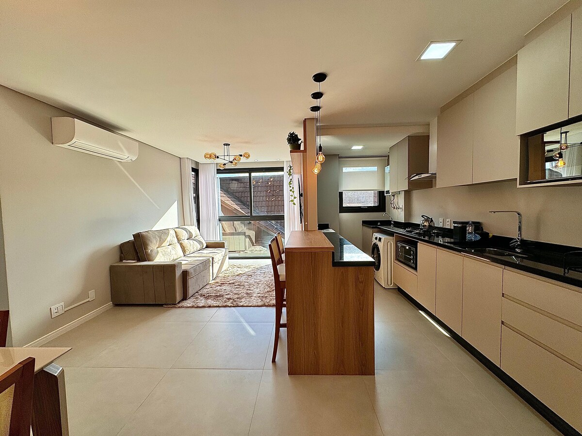 Apartamento com 1 suíte, 1 quarto com duas camas de solteiro e um sofá cama de casal na sala. O apartamento é todo mobiliado e equipado (roupas de cama, mesa e banho, utensílios para cozinha, inclusive equipamento para fazer fondue), sacada grande, moderno e aconchegante. A TV é Smart com acesso liberado à NETFLIX. Possui lareira e calefação. Está localizado no Knorville, condomínio familiar de alto padrão rodeado de lindas paisagens a 3 min do centro de Gramado.