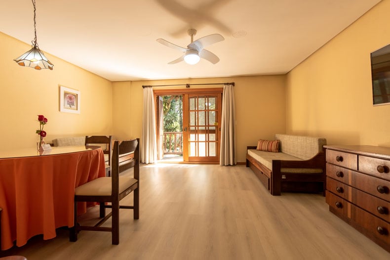 Flat Luxo no Mountain Village para até 4 pessoas. Quarto luxuoso com vista para o bosque, decoração clássica com cama Queen, sala com 2 sofás-cama e cozinha tipo americana, ambientes com ar condicionado quente e frio, piso aquecido, lareira, TV LCD com TV a cabo, internet e mini cozinha americana com microondas, geladeira e máquina de lavar louça. Banheiro com pia em granito, duas cubas e banheira de hidromassagem. Voltagem do flat toda 220V.