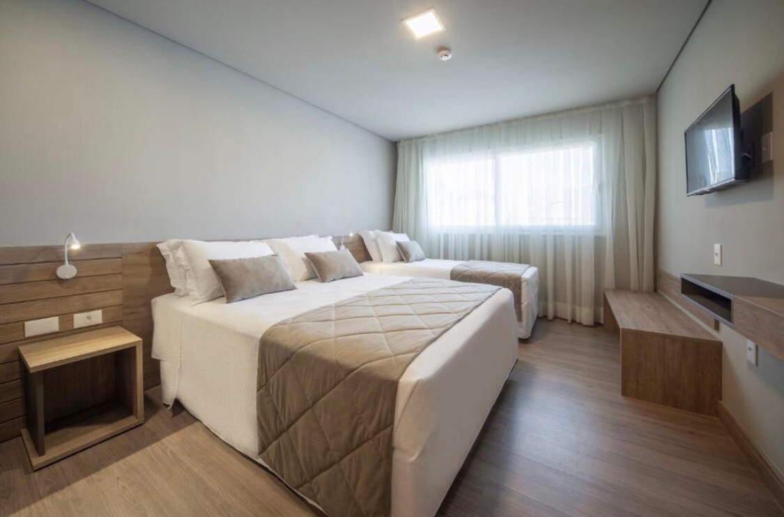 Quarto localizado no Hotel Laghetto Stilo Borges em Gramado - RS. Hotel localizado na área central da cidade, a apenas 100 metros da rua coberta, oferece multifuncionalidades como restaurante, piscina, sauna e jacuzzi, academia, sala de jogos, dentre outros. por se tratar de uma cota do hotel, o café da manhã não está incluso, podendo ser comprado à parte. O quarto por padrão incluí uma cama de casal e uma cama de solteiro, podendo ser requerida a adição de uma cama de solteiro ao quarto.