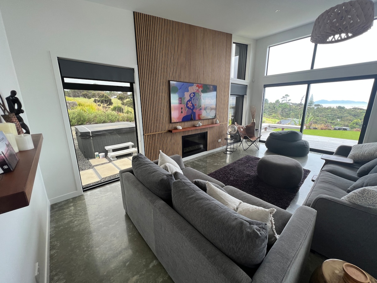 •Modern architecturally designed bach with modern amenities and decor. •Sunny and heated. •Spa Pool •Sip cocktails on the deck or in the spa while watching the sunset. Expansive ocean/harbour views. •Escape from the city, work remotely or relax. Centrally located, close to golf course and shops. •Landscaped section Access to golf simulator available on request at a flat fee of $1000/booking. Also look at our property next door: "Luxury mangawhai escape"