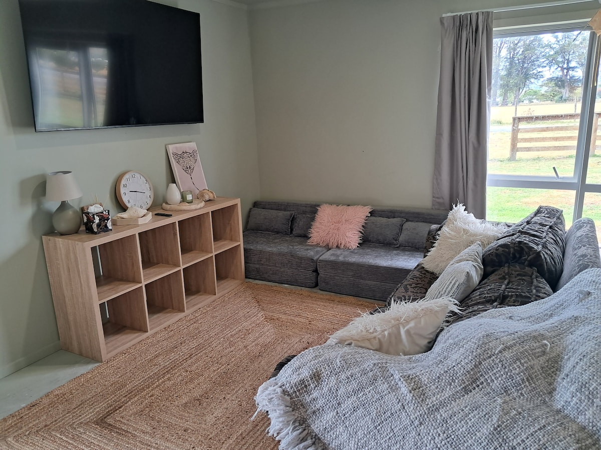 Delux Plush King Single & Single Bed. Chalet Insulated. Double glazed doors and windows. Country view of hills, and farm animals. Roll up wall at verandah for weather protection. New Shower and toilet just at Chalet door. On Highway 35, expect truck and other vehicles, during the week. Chalet is cosy & private It's warm in winter & cool in summer. Native trees. We live on the land, happy for you ask if you need anything.