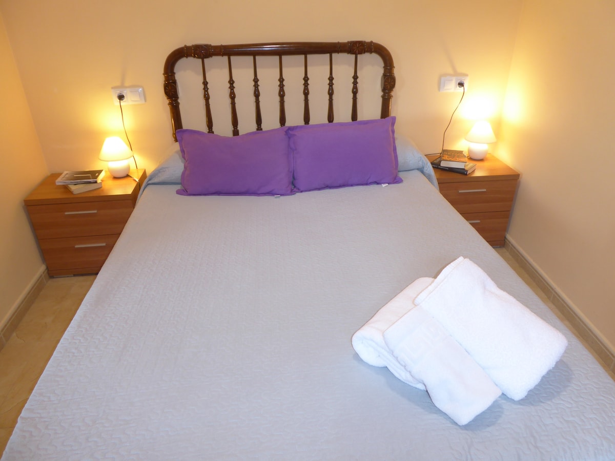 Disfruta de este alojamiento tranquilo y céntrico. Con una amplia terraza. 2 dormitorios 1 con cama de matrimonio , otro con 2 camas individuales, 2 baños, 1 salon/comedor amplio, luminoso y sofá cama y una cocina completa. Facilidad para aparcar en la puerta.
