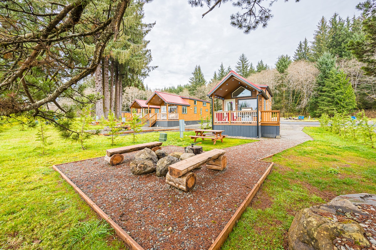 Enjoy this newly built eco-cabin just minutes from Rialto Beach. Tucked into a private spot at our nature retreat, it’s a calm and relaxing place to land — fully outfitted for your stay. Use it as a launch point for exploring the West End of Olympic National Park, or settle in at camp for some R&R. This tiny house includes a private wood-fired hot tub and shared access to our cedar sauna. Traveling with friends or family? Stay close — there are other unique lodging options on site too.