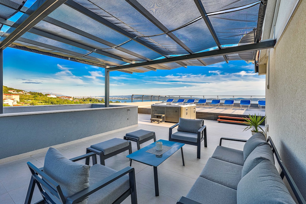 ZALOO sea-view luxurious apartment with hot tub. Apartment Zaloo (62 m²) is a brand new residence located in Split, Dalmatia region near the city beach Žnjan. The apartment features a beautiful sea view from both the living room and covered terrace with small garden, which also includes a hot tub and comfortable sitting area. A free Wi-fi connection and a private parking spot (in the parking garage) is included, too.