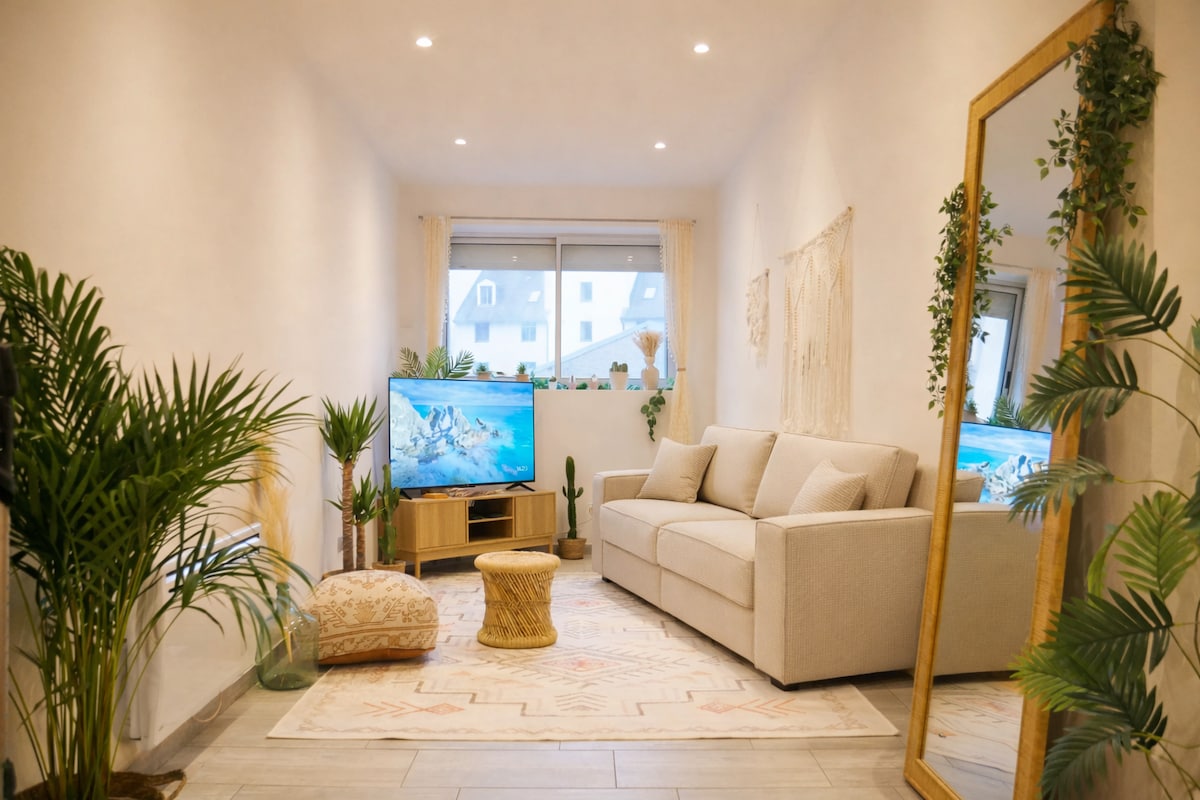 Nous avons entièrement rénové notre appartement en plein centre ville pour en faire un espace chaleureux et agréable à vivre. Tout est pensé pour votre confort : un salon accueillant, une cuisine équipée, une chambre avec une literie confortable et une salle de bain moderne. Vous y trouverez tout le nécessaire pour un séjour sans souci : WiFi, machine à laver, sèche-cheveux… Que vous soyez en voyage ou en déplacement, nous serons ravis de vous accueillir !