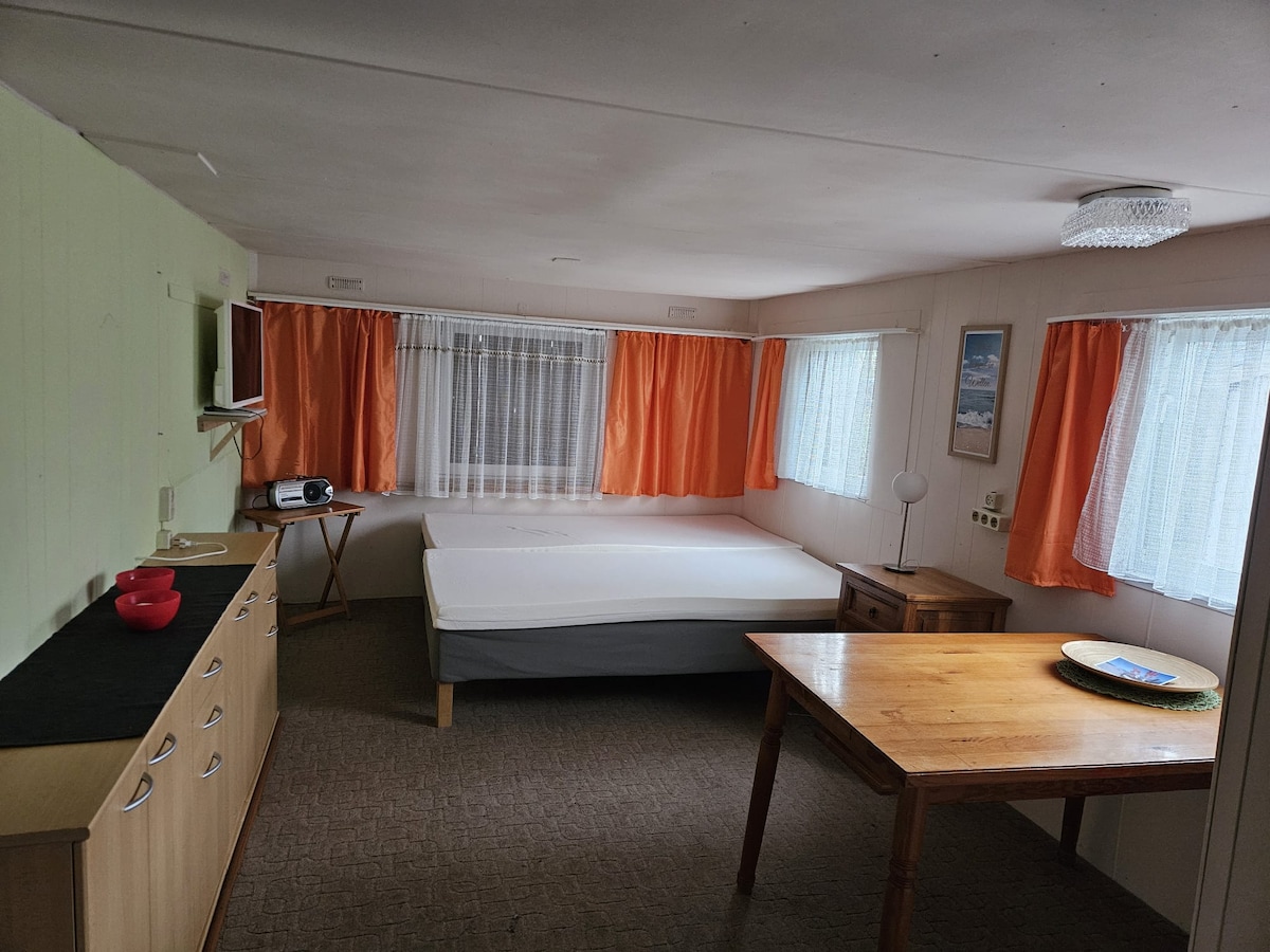 Bungalow inmitten eines großen Gartens in sehr ruhiger Lage und jeweils 10 Minuten mit dem Auto bis zum Strand (z.B. Lubmin) und nach Greifswald. Der Bungalow besteht aus einem Wohn- und Schlafraum mit Doppelbett und Schlafsofa, einer Küche und einem Badezimmer sowie einer großen Terrasse. Der große Garten hat Platz für die Kleinen zu spielen und die Großen zu ruhen. Es ist möglich während des Aufenthalts Kunstkurse gegen Gebühr zu belegen. Ein Atelier befindet sich auf dem Gelände.