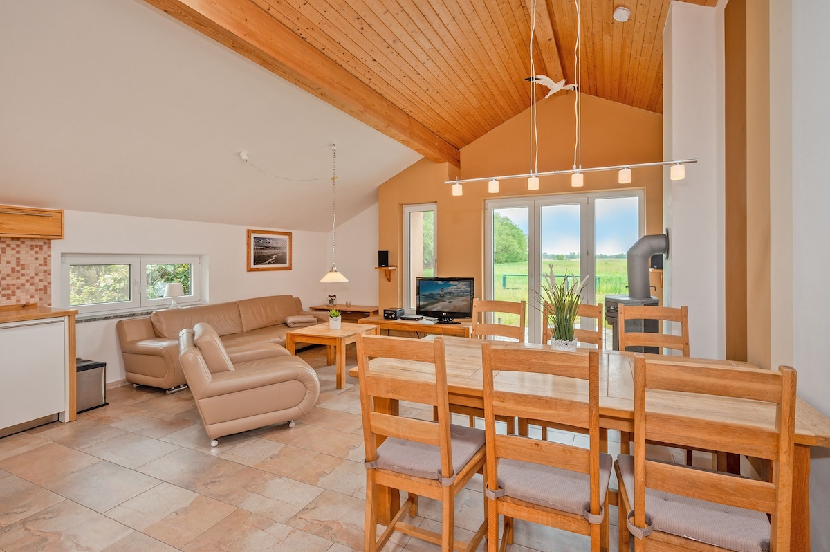 Holiday apartment in a BIO solar house (allergen-free) in the landscape park Usedom on a big garden plot, 15 min to the Baltic Sea, plastic-free full equipment in vintage style, own terrace to the south, garden use possible, free ATB bicycles, e-bicycles + e-scooter use possible, play table , WLAN, SMART TV, barrier-free, very quiet single location with a fantastic view of the landscape, 4 people + 2 day visitors possible, PC workstation, own parking lot, parking lot on the beach can be rented