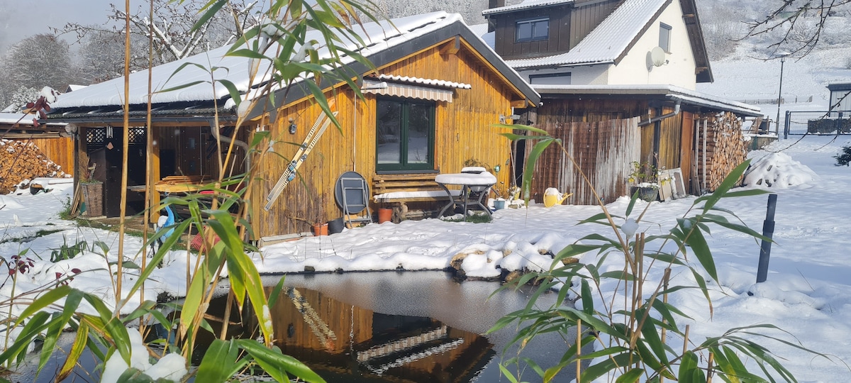 Abschalten und Wohlfühlen - Unser Ferienhaus bietet Ihnen eine kleine Flucht vom Alltagsstress und Lärm. Auf 55 qm gibt es genügend Platz für romantische Zweisamkeit, aber auch Kinder sind willkommen, denn sie können sich "in die kleine Höhle" unterm Dachspitz zurückziehen. 🐕 HUNDEPARADIES 🐕 ♡ Es erwartet euch ein komplett eingezäuntes Domizil auf ~2000 qm ♡ Von der Terrasse aus blicken Sie in die Natur und können die Geräusche des Teiches und das Plätschern des Wildbaches genießen.