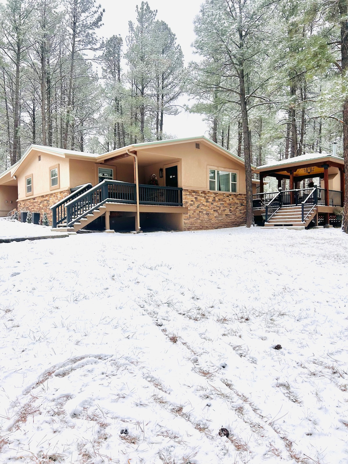 This cozy cabin with central air/heat and carbon monoxide detectors. Private hot tub deck with curtains and private walls. Primary bedroom and bath downstairs, 2 bedrooms and bath upstairs. Large entertainers deck w fire pit. FREE firewood. Minutes away from Ski Apache & Winter Park for skiing, hiking, fishing, zip lining & mountain biking. Close proximity to Ruidoso, Alto Lake and Flying J Ranch .