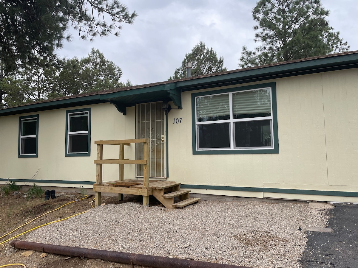 Peaceful mountain cabin located 1 minute away from Midtown Ruidoso's shopping, dining, and activities. This 1942 cabin offers two bedrooms and one bath as well as a spacious outdoor deck, kitchen, and living room. Private but close to town. Elk, deer & wild turkey are abundant on our acre lot and in perfect view from the cabin deck. This quiet oasis offers Wi-Fi, a propane fire pit, electric fireplace as well as coffee, hot chocolate, and oatmeal. You'll feel miles away but still close to town.